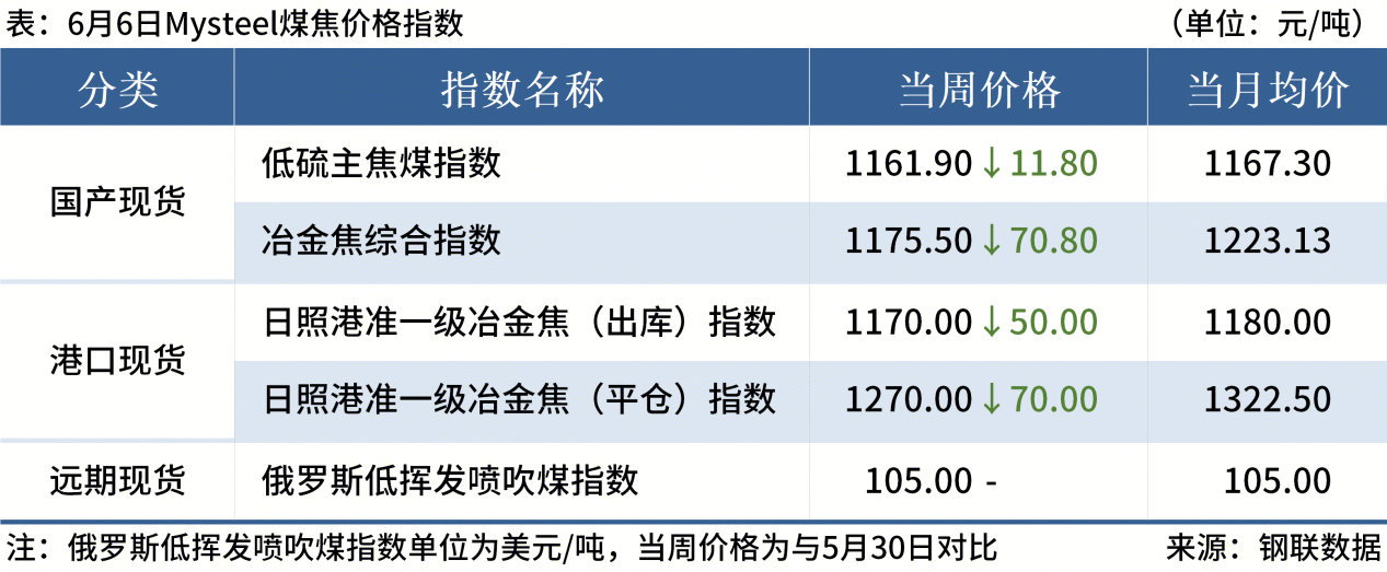 ◎ 2025年5月至6月初,蒙古進(jìn)口煉焦煤市場價(jià)格呈現(xiàn)持續(xù)下行趨勢,甘其毛都口岸蒙5#原煤價(jià)格從5月7日的830元/噸降至6月6日的705元/噸,累計(jì)跌幅達(dá)15.06%。詳情>>