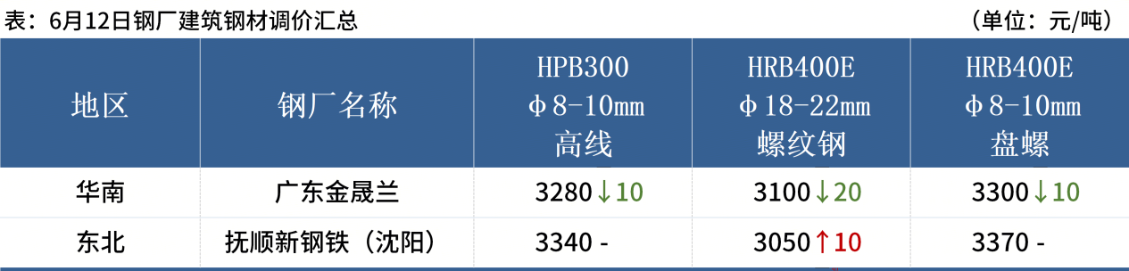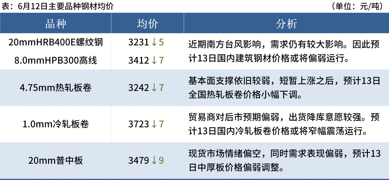 ◎ 6月12日,國內(nèi)鋼材市場震蕩偏弱運行,唐山遷安普方坯出廠含稅下跌30報2890元/噸。