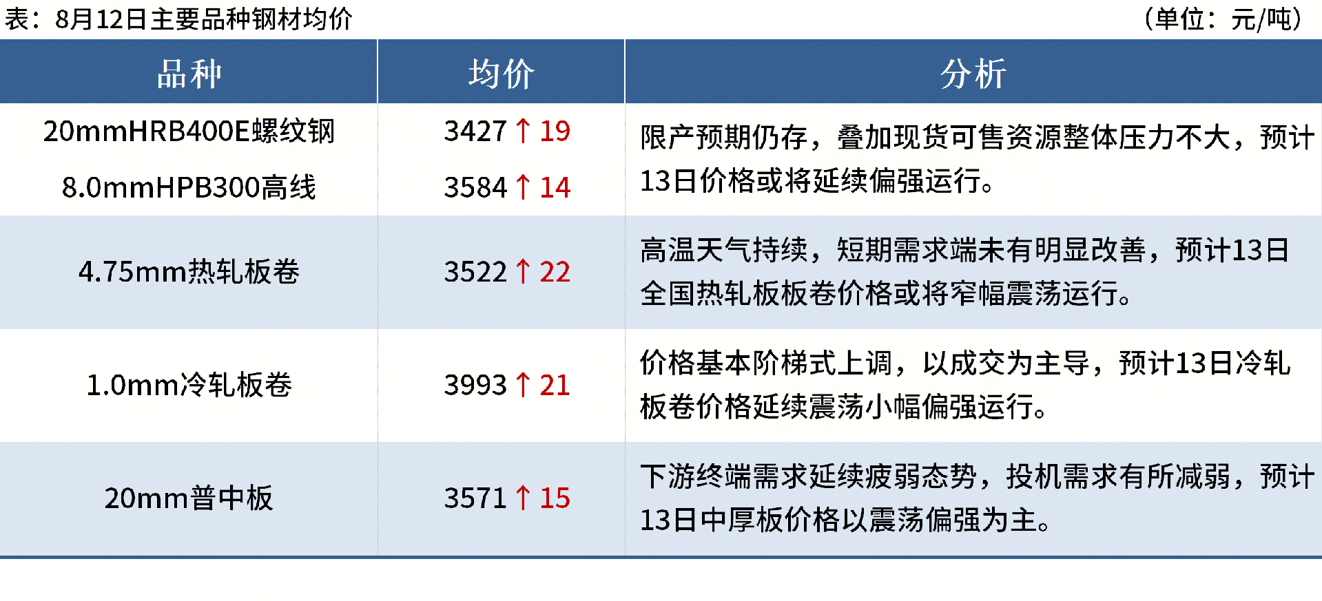 ◎鞍鋼、本鋼、凌鋼同步上調(diào)9月份產(chǎn)品價(jià)格。熱軋、線材、螺紋鋼均上調(diào)200元/噸,酸洗、冷軋、冷硬、鍍鋅、無取向硅鋼上調(diào)300元/噸。本鋼電鍍鋅、特鋼分別上調(diào)300元/噸和230元/噸,凌鋼特鋼上調(diào)230元/噸。