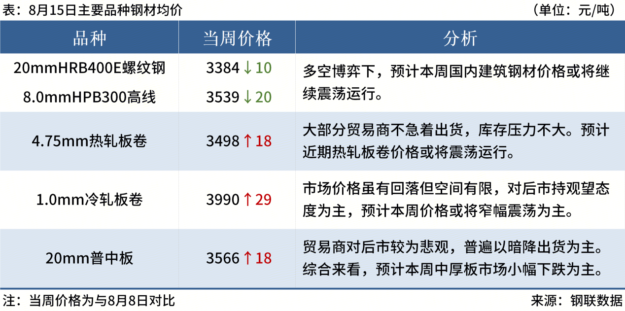 ◎ 8月15日,全國(guó)主港鐵礦石成交105.60萬(wàn)噸,環(huán)比減18.9%;237家主流貿(mào)易商建筑鋼材成交10.51萬(wàn)噸,環(huán)比增25.4%。