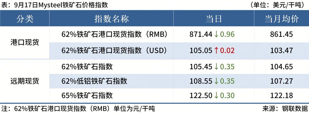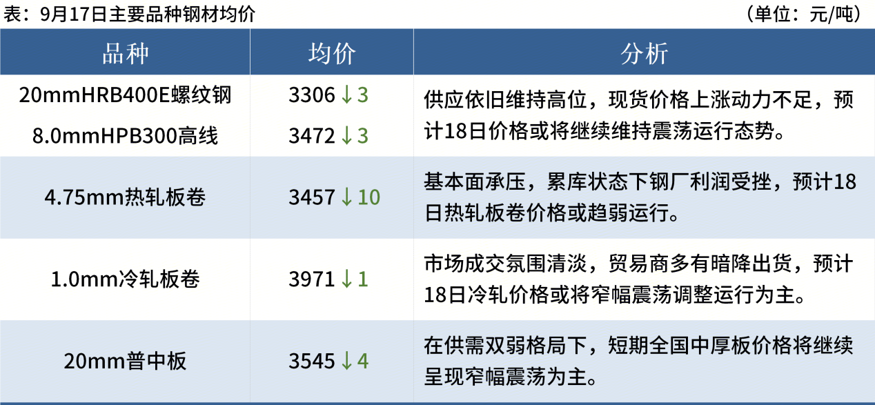 ◎ 9月17日,全國(guó)主港鐵礦石成交126.50萬噸,環(huán)比減9.3%;237家主流貿(mào)易商建筑鋼材成交10.27萬噸,環(huán)比減7.1%。