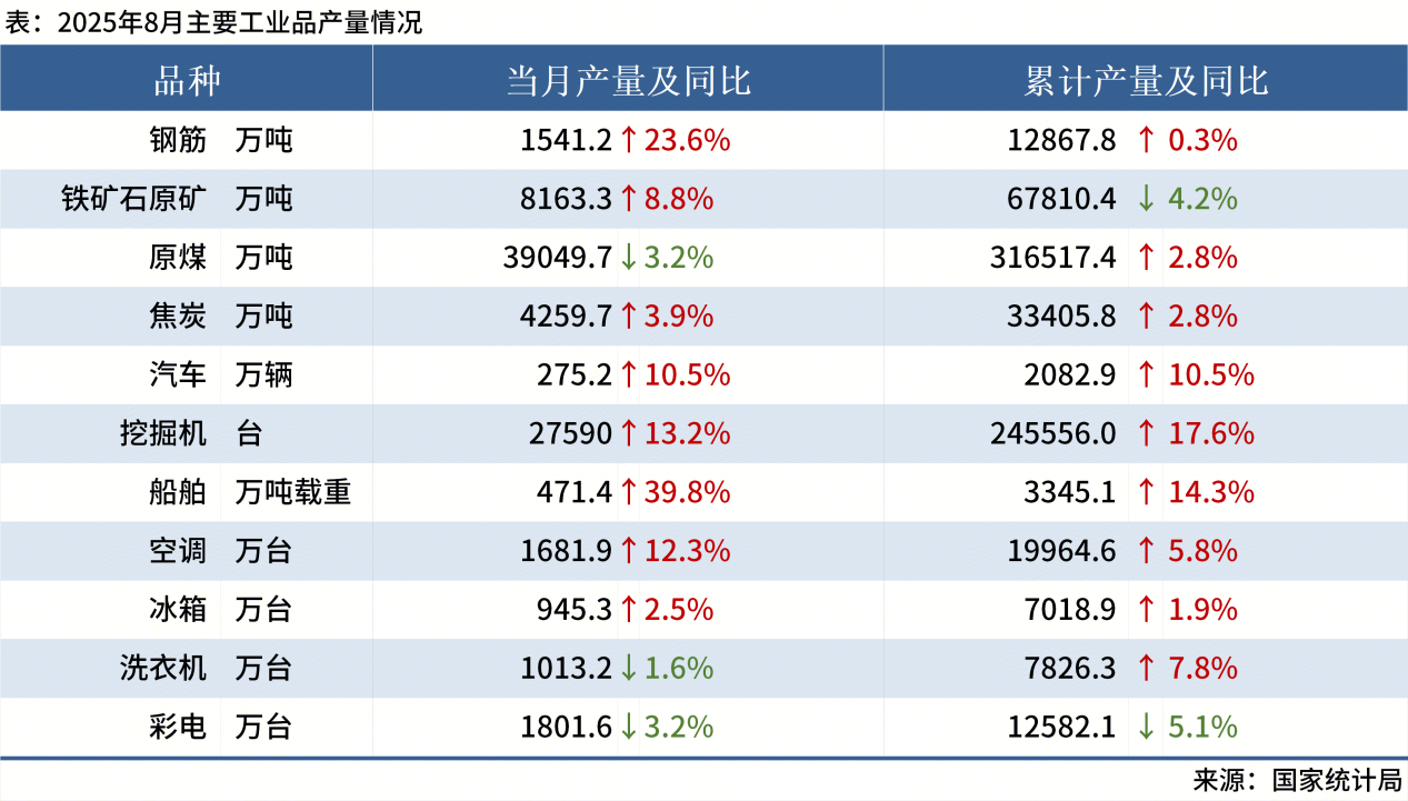 ◎ 國(guó)家統(tǒng)計(jì)局:8月中國(guó)鋼筋產(chǎn)量為1541.2萬噸,同比增長(zhǎng)23.6%;1-8月累計(jì)產(chǎn)量為12867.8萬噸,同比增長(zhǎng)0.3%。其他主要工業(yè)品產(chǎn)量如下: