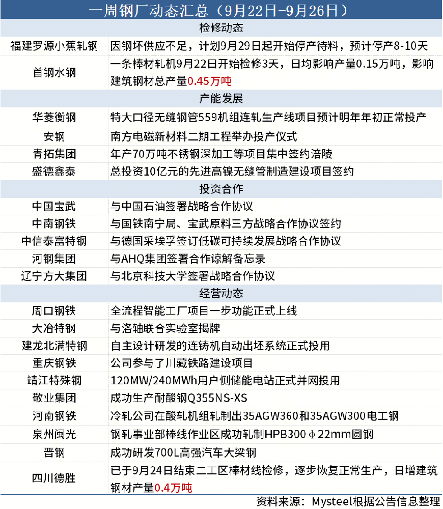 據(jù)Mysteel不完全統(tǒng)計(jì),本周(9月22日-9月26日)2家鋼廠(chǎng)發(fā)布檢修信息,具體如下: