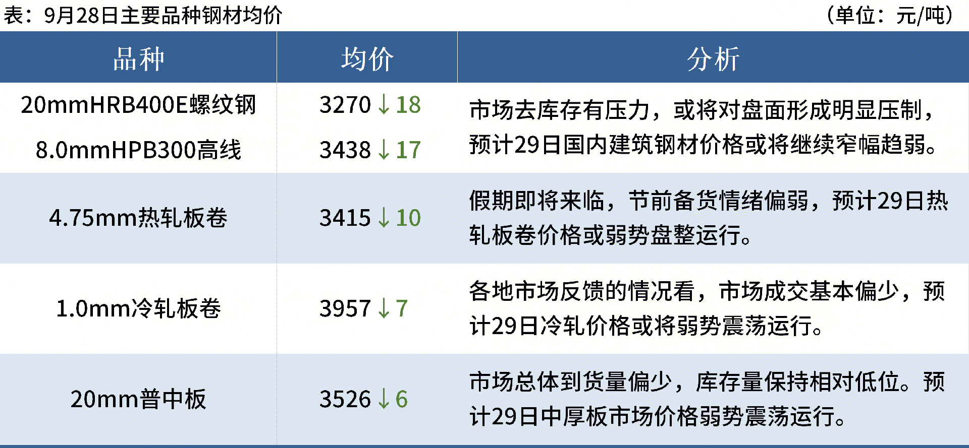 ◎ 9月28日,國內(nèi)鋼材市場(chǎng)弱勢(shì)下跌,唐山遷安鋼鐵普方坯出廠含稅價(jià)下調(diào)10報(bào)2970元/噸。