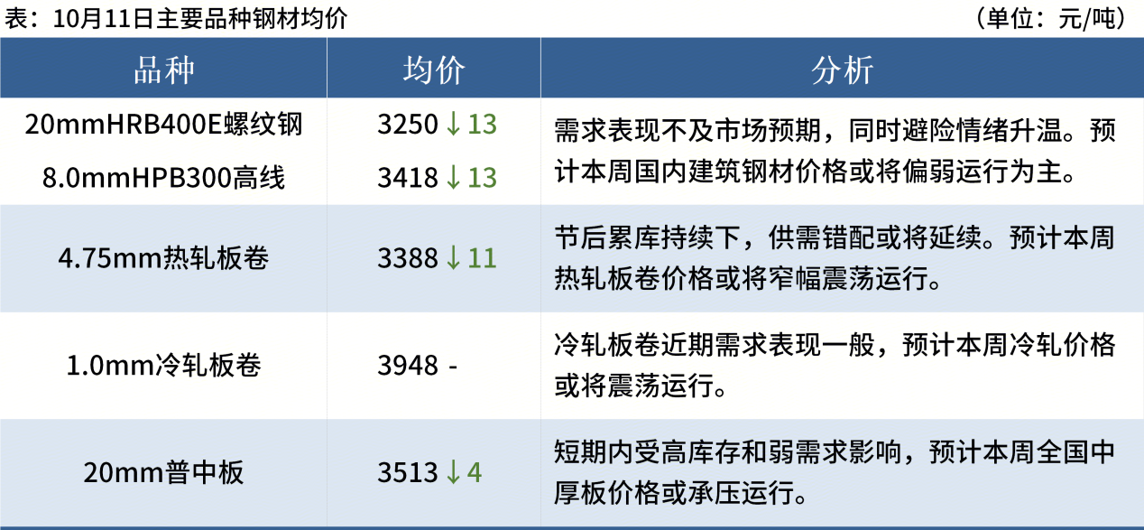 ◎ 10月11日,全國(guó)主港鐵礦石成交50.60萬(wàn)噸,環(huán)比減58.3%;237家主流貿(mào)易商建筑鋼材成交9.14萬(wàn)噸,環(huán)比減7.1%。
