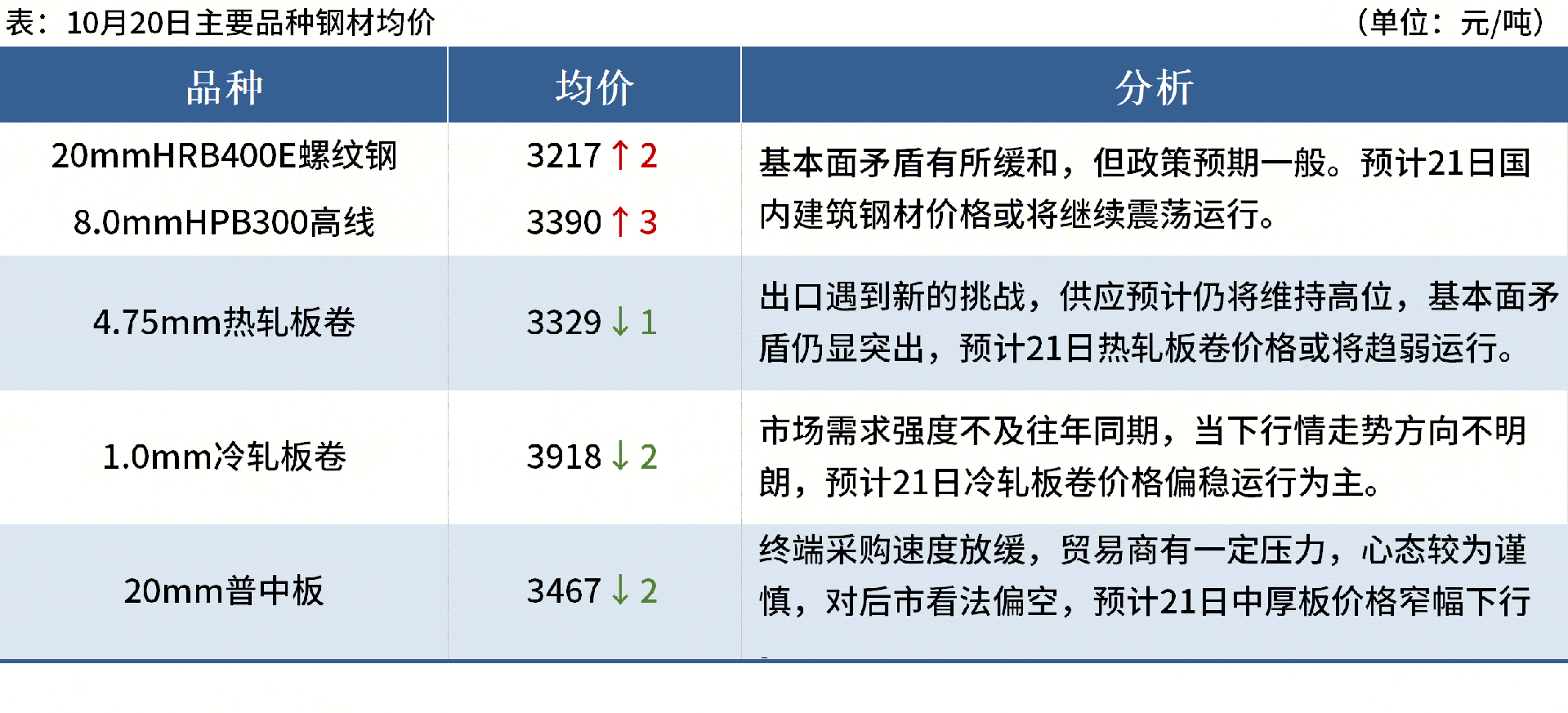 ◎10月20日,中天鋼鐵出臺10月下旬價格,螺紋下調(diào)50元/噸,線材盤螺下調(diào)50元/噸?,F(xiàn)華東螺紋3350元/噸,線材盤螺3550元/噸。