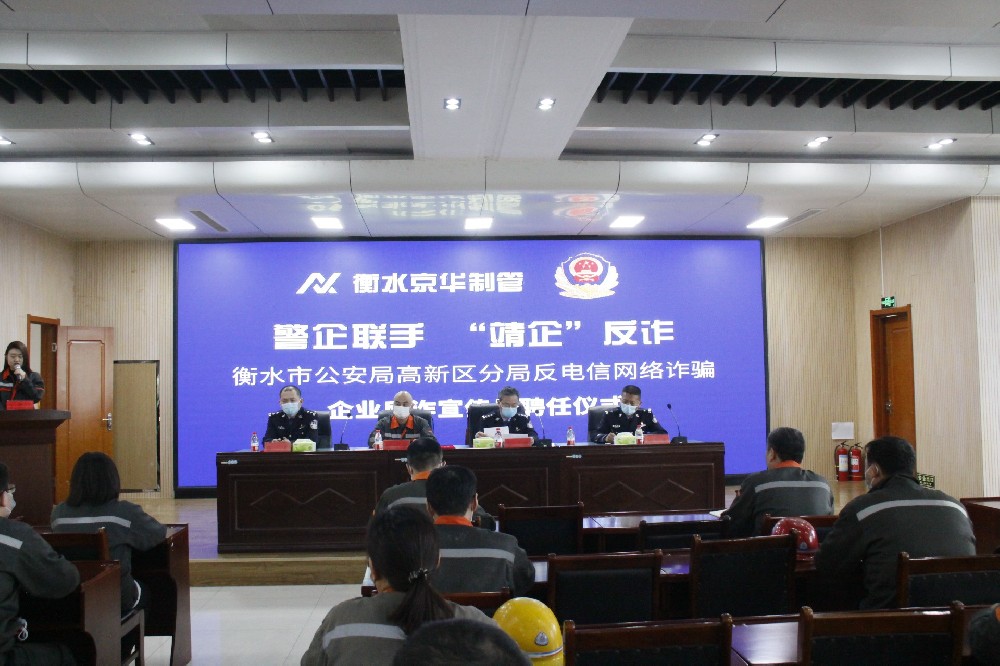 警企聯(lián)手 “靖企”反詐— 衡水京華召開(kāi)企業(yè)反詐宣傳員聘任儀式4月28日,衡水市公安局高新區(qū)分局黨委委員、副局長(zhǎng)張?bào)K等一行4人蒞臨公司宣傳反詐知識(shí),在公司辦公樓五樓召開(kāi)了以“警企聯(lián)手,‘靖企’反詐”為主題的企業(yè)反詐宣傳員聘任儀式。公司常務(wù)副總趙志強(qiáng),生產(chǎn)副總劉國(guó)勇,總經(jīng)理助理馬亮同公司員工代表參與會(huì)議。會(huì)議上衡水市公安局···