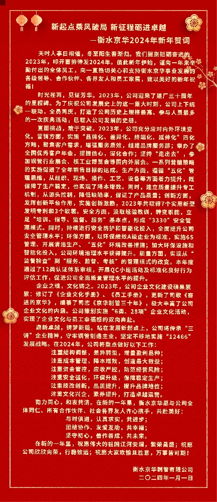 吉陽高照、鑼鼓喧天、舞獅歡騰。2023年12月8日,公司按照集團(tuán)精神指示隆重舉行以“賡續(xù)奮進(jìn) 鑄夢京華”為主題的三十周年慶典活動。政府領(lǐng)導(dǎo)、合作伙伴及職工代表1800余人齊聚衡水京華,共襄盛舉! 慶典儀式上首先由總經(jīng)理溫朝福致開幕詞。在致辭中,溫總首先代表公司創(chuàng)始人杜雙華先生和公司領(lǐng)導(dǎo)班子,向長久以來關(guān)心和支持我們的···